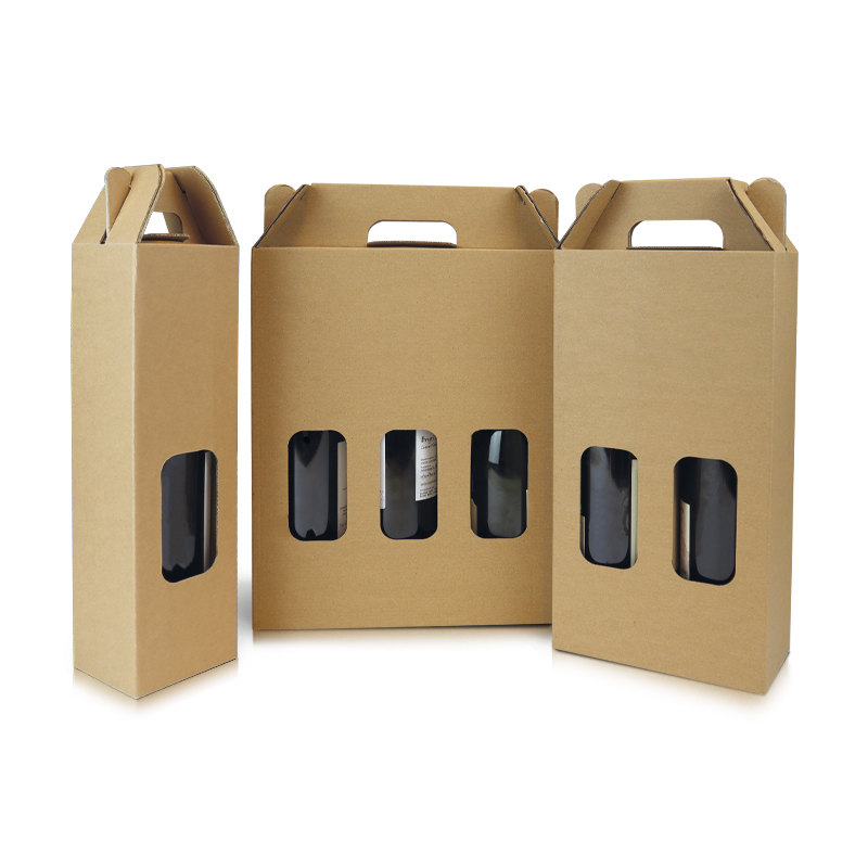 Scatole automontanti in microonda avana o rivestite con carta colorata per 1,2 o 3 bottiglie da 75 cl, maniglia H 65 mm. Vengono consegnate stese.